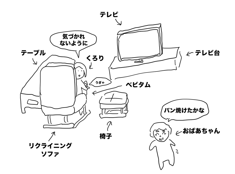 どうやら、焼きたてのパンをパン焼き器から取り出すために、おばあちゃんがキッチンに入って行ったよう。