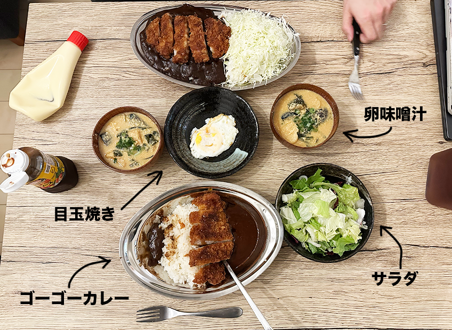 ロン毛ヒゲが帰宅したので、作ったゴーゴーカレーとうどん味噌汁をふるまう。