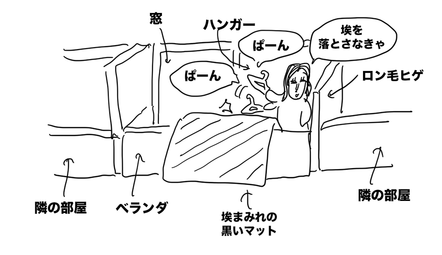 私が日記を書いている間、ロン毛ヒゲはベビタムをあやしながら、ホットカーペットの上に敷いてあった黒マットを取り出して、ベランダでぱんぱんとハンガーではたいていた。