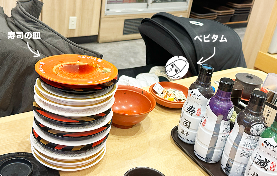 店内では前回同様、ベビーカーを置ける設置を確保してもらい、ラブリー寿司タイムだ!