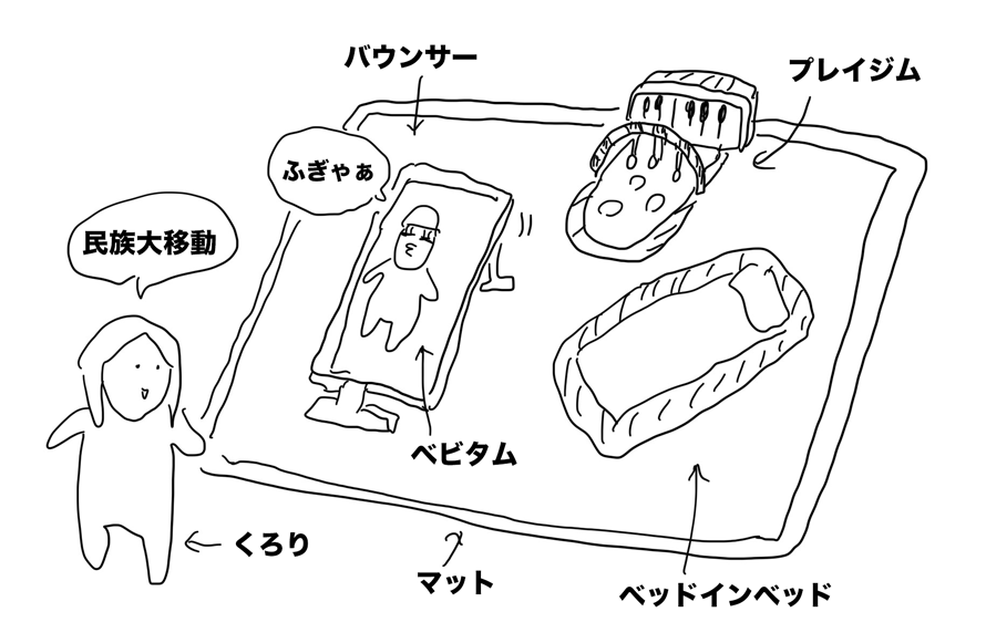 ベビタムは、バウンサーに乗せたり、ベッド員ベッドに乗せたり、プレイジムに寝かせたりと、泣き出しそうになるたびに民族移動。