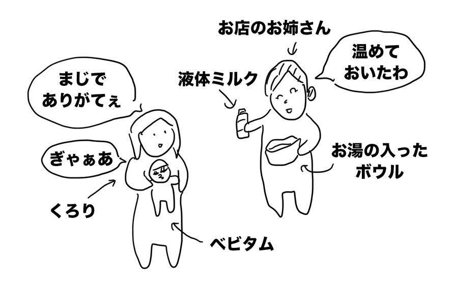 途中でベビタムがぐずり出したので、爆速で食べ、店員さんが温めてくれた液体ミルクをあげた。