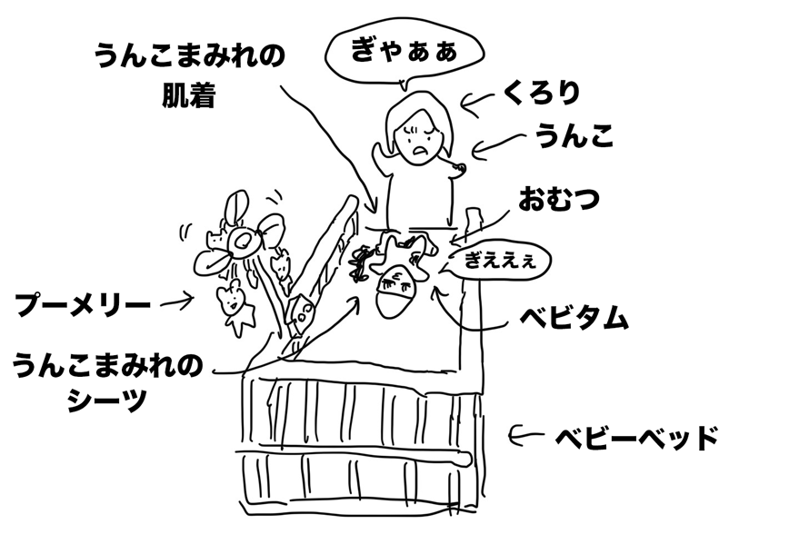 急いで着替えさせようとしたら、シーツもうんこまみれ