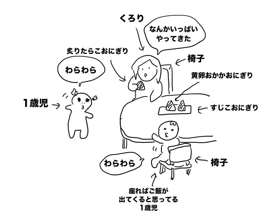ベビタムをスタッフの人に預けて、テーブルでおにぎりをむしゃむしゃ食べてると、1歳くらいのキッズたちがわらわらと寄ってくる。