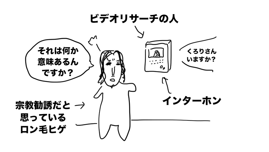 私が数日前に申し込んだ、ビデオリサーチのモニターの担当者が尋ねてきたのだが、そのことを知らないロン毛ヒゲが宗教勧誘と勘違いして、めちゃ塩対応。