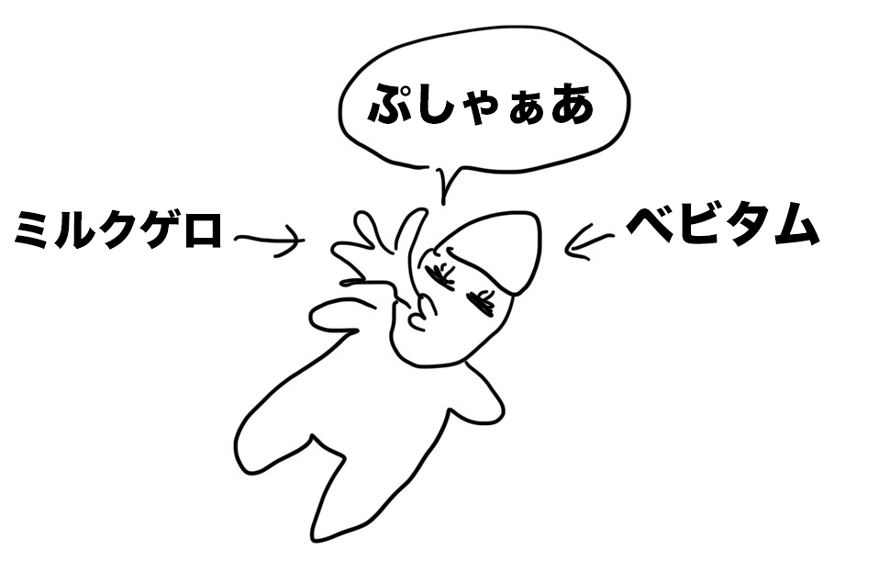 目も鼻も口も、ベビタムの顔面はミルクまみれ。