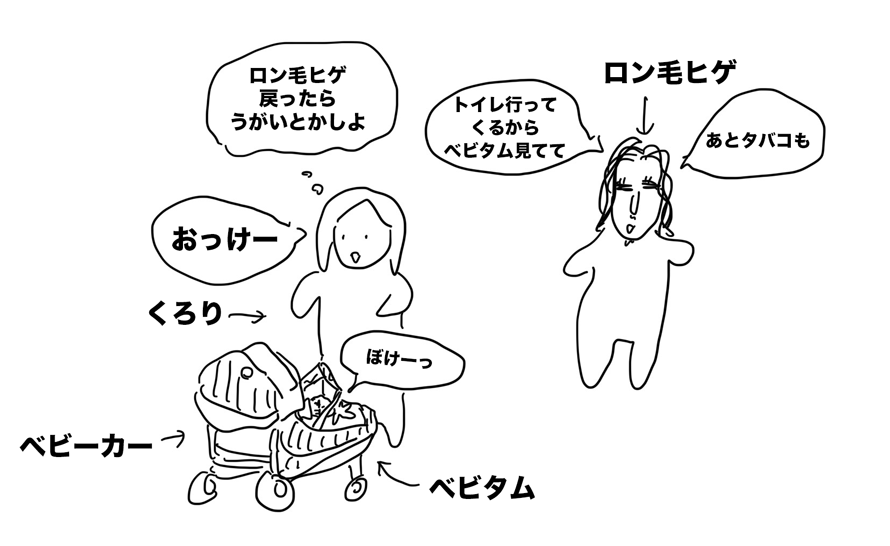 ロン毛ヒゲ「ちょっとトイレ行ってくる。あと、タバコ。その間、ベビタム見てて」