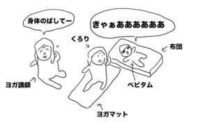 今日は2度目のママヨガの日!前回もベビタムは床に寝転んでいたが、今回も床に寝転がるだけになることであろう。