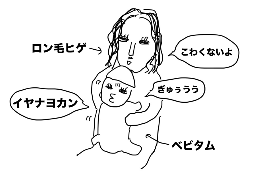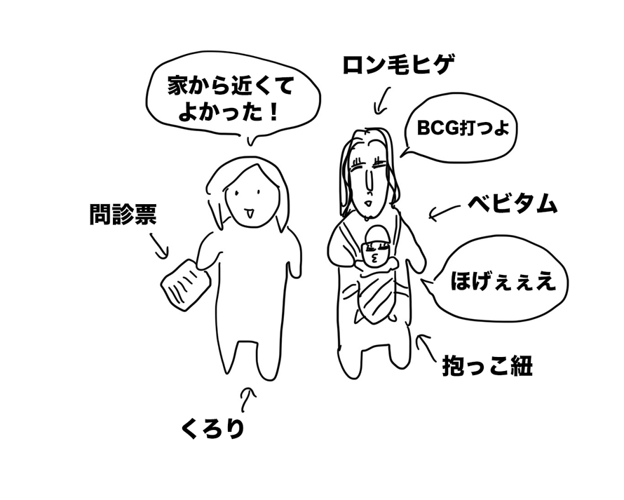 朝のうちに問診票を書いて、いつもの小児科へ向かうロン毛ヒゲ、ベビタム、そして私。