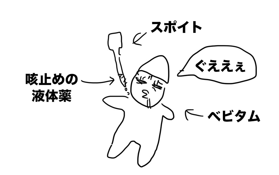 薬剤師さんからは「お薬を哺乳瓶の乳首であげると、ミルクが嫌いになるかもしれないのでスポイトであげてください」と言われたので、さっそく咳止めの液体をベビタムにスポイトであげてみよう。