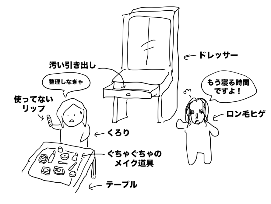 家具移動後は、ドレッサーの中でカオス状態になっていたメイク道具をすべてテーブルの上に取り出して整理をした。