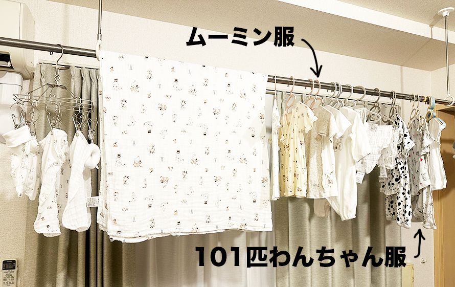 量が多いので、とりあえず一番小さい新生児50cmサイズの服だけ洗って、アカチャンホンポで購入したハンガーに干してみる。