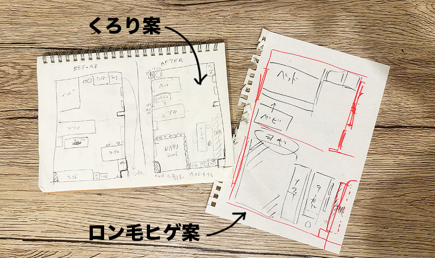 お互い理想の図面を書いて話し合い、テーブルと棚を移動させて行く。