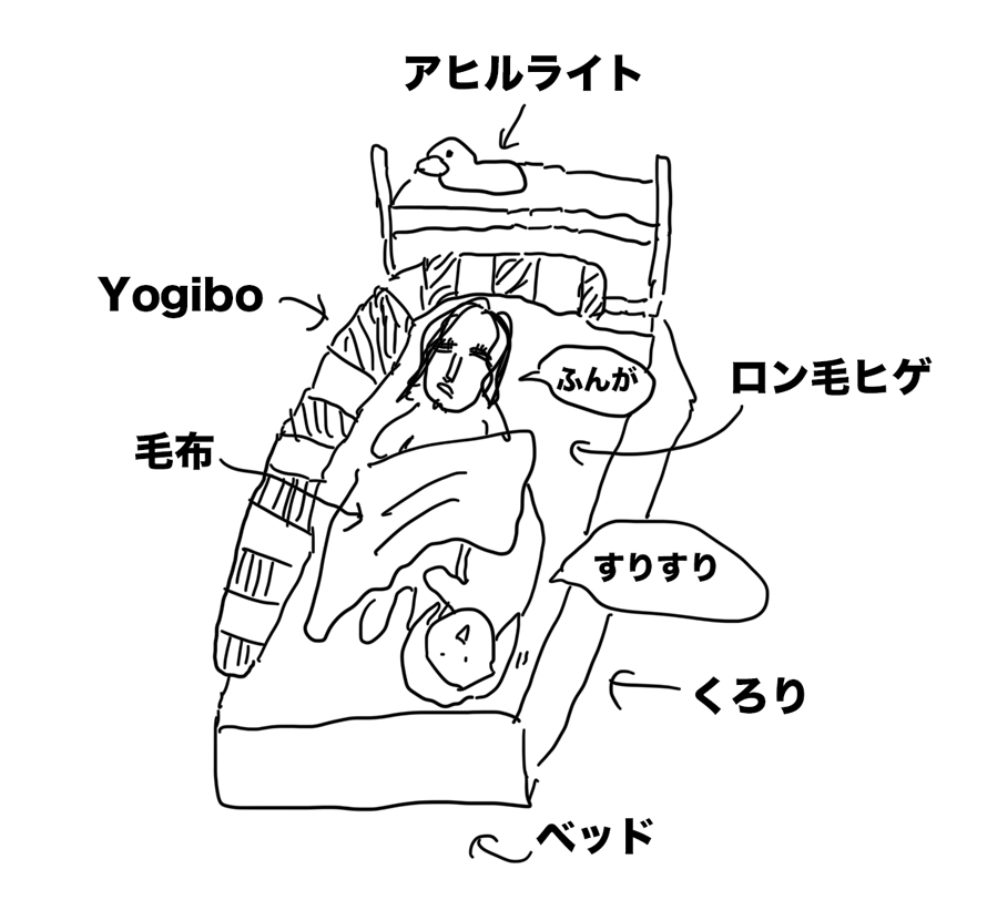 一旦、頭を枕の反対側にして、ロン毛ヒゲの足をすりすりしてみよう。