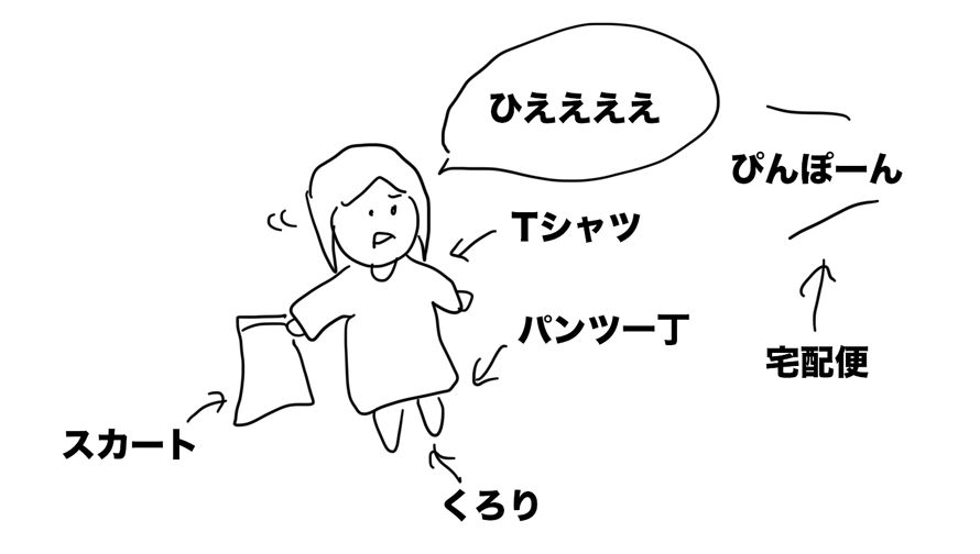 その日はパンツ一丁で寝ていたので、急いではけそうなスカートを探して玄関へ。