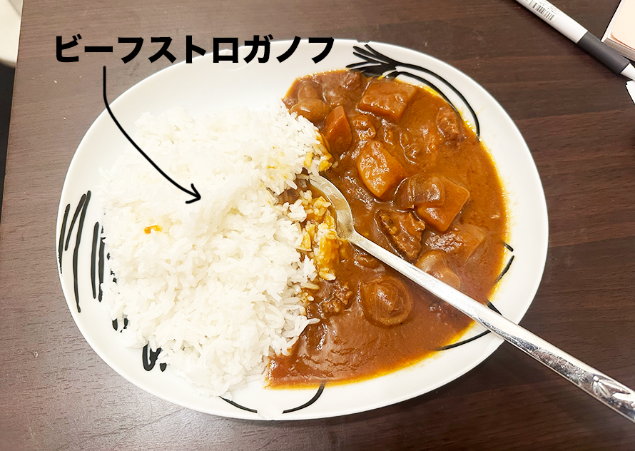 Kaldiで買ったタイ米を炊いて、インスタントのスープビーフストロガヌフと合わせてご飯タイム。