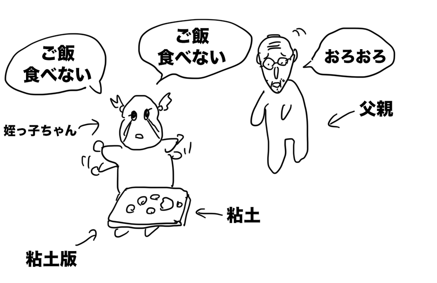 夜ご飯に呼ばれて下のフロアに行くと、粘土遊びをやめたくなくて泣き叫ぶ姪っ子ちゃん。