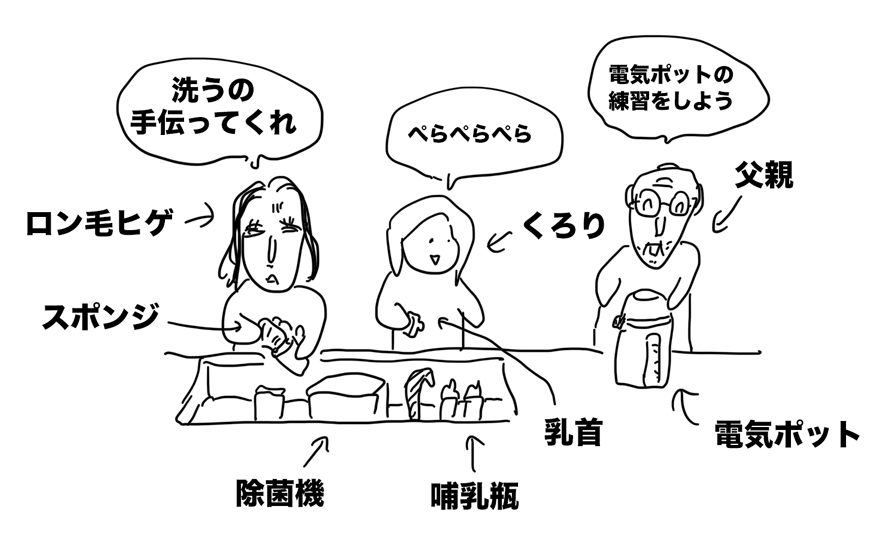 除菌前に、ロン毛ヒゲと一緒に母乳瓶を洗っている間、となりで父親がひたすら色々と話しかけてきたので、洗うのを中断して対応していたらロン毛ヒゲがちょっと怒っていた。