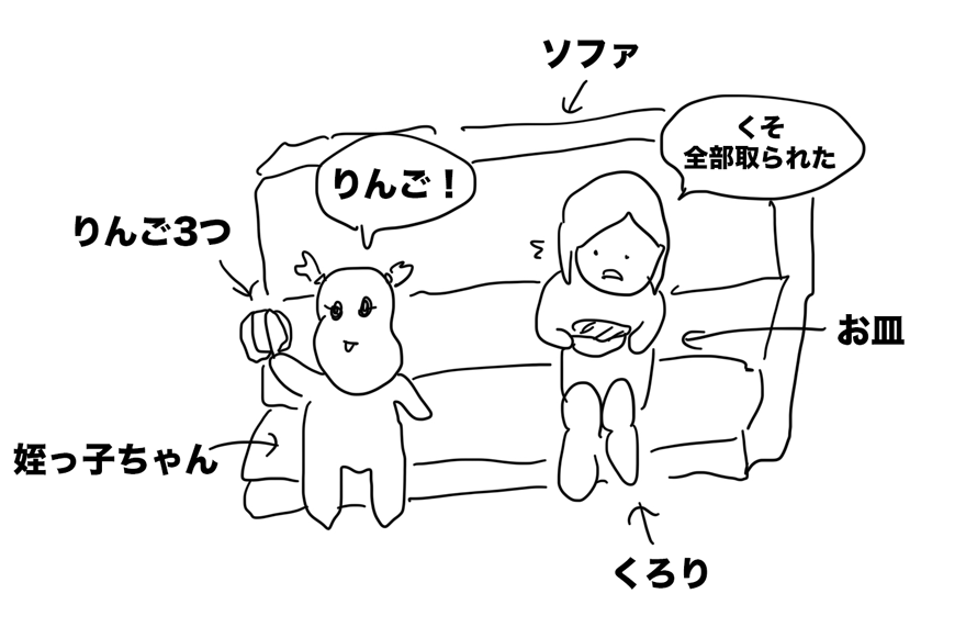 食後はりんごをもらったので、姪っ子ちゃん・弟嫁ちゃんと分け合って食べていたが、残り3つは姪っ子ちゃんに全部奪われてしまった。