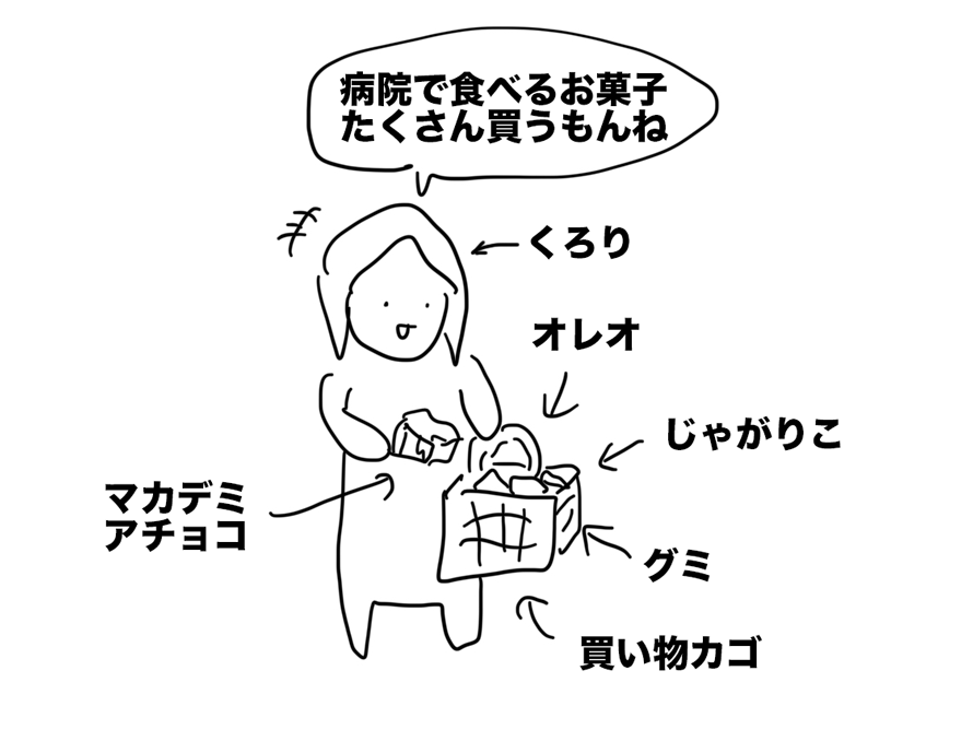 入院先ではベジタリアン入院食しか出ないので、お腹を膨らませるためのお菓子をたんまり買おう!!!