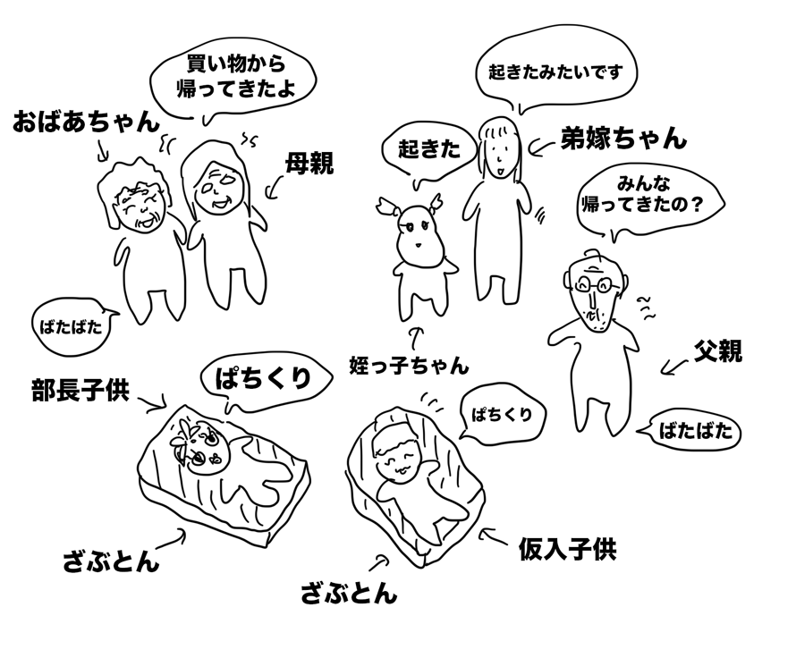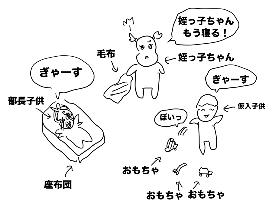 子供の名前など、くだらない話をしながら、子供らを座布団の上で横にしていく。