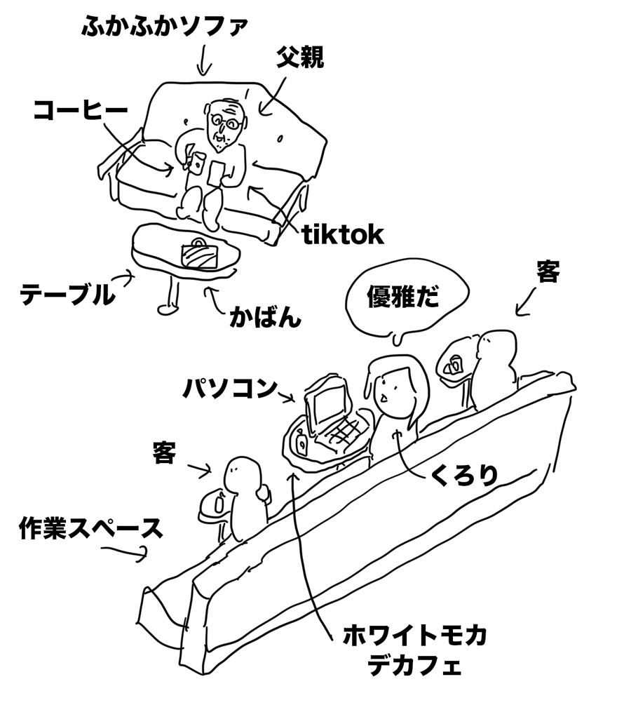 スタバ到着後、自分は作業席でパソコンかたかた、父親はひとりソファ席でのんびりコーヒーを飲んでいた。