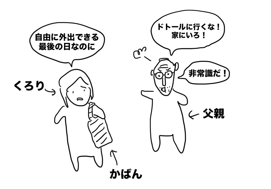 これから嫌でも実家にこもりっぱなしになるというのに、なんで自由に外出できる最終日に、家に閉じこもらせようとするのだ・・!