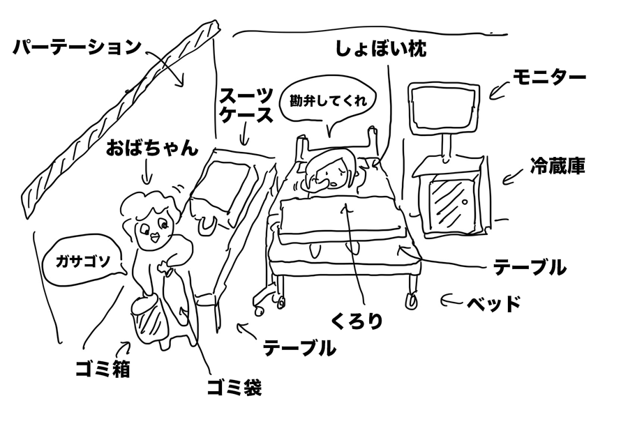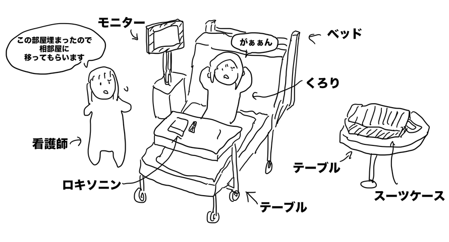 強制退去された病室は4人部屋。先ほどまで、自分を入れて2人分しか埋まってないのに、気づいたら全部埋まっているではないか。