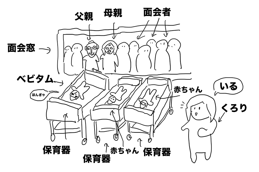 壁で仕切られている授乳コーナーを出て、新生児室に行くと、窓越しに大勢の面会者がこちら側を覗いている。