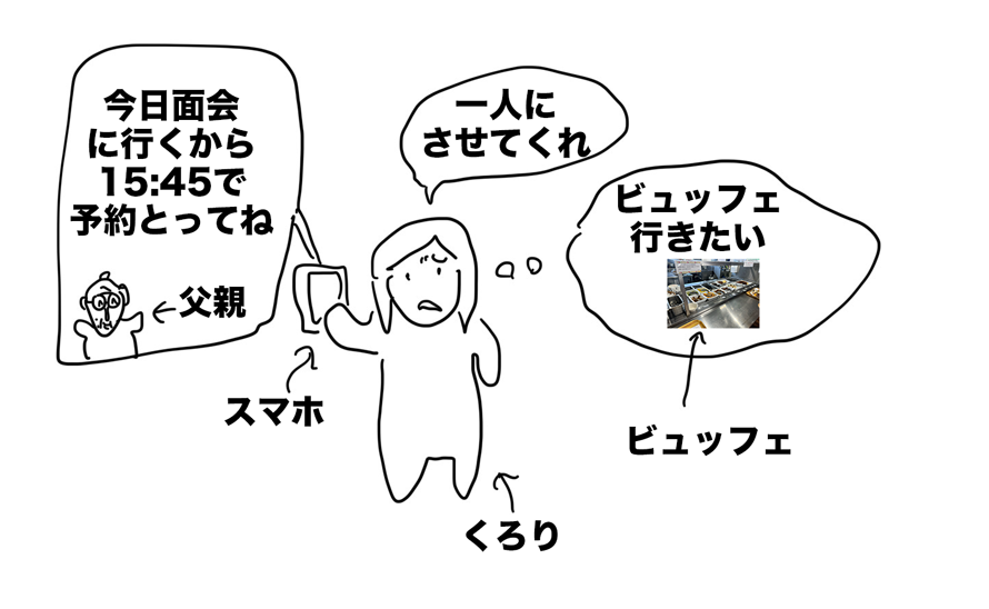 せめて、15-16時のビュッフェ時間に被らないよう、窓越し面会を16:15にしてもらった。