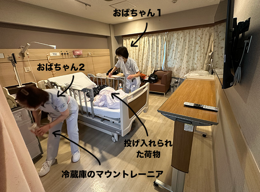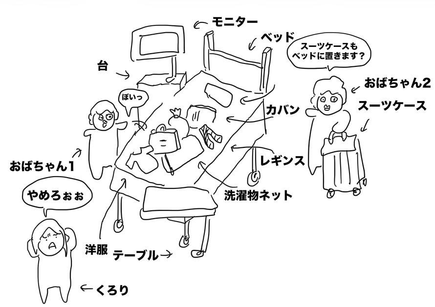 すると、おばちゃん2人がテキパキと部屋にあるあらゆるものをベッドの上にぽいぽい置き始める。