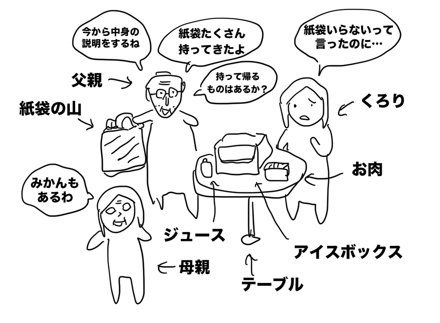 父親「今日はおやつと果物と肉を持ってきた。これはこうでこれは・・」