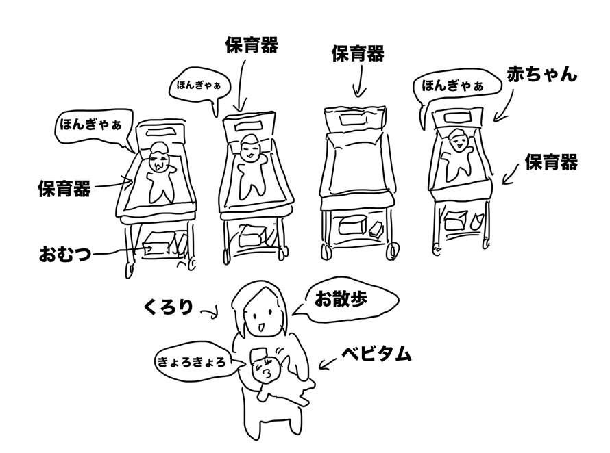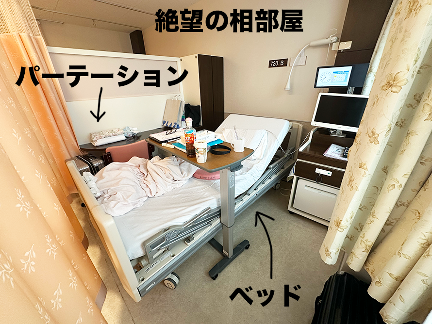 ベビタムを保育器に戻し、自分はテンションの上がらない相部屋へ。