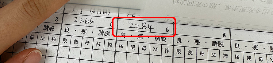 ベビタムの保育器に挟んであるバインダーを取り出し、体重を確認する・・。