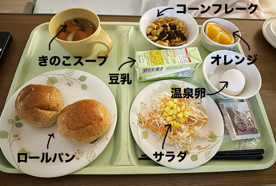 朝7時になると、朝ごはんが運ばれてくる。今日は温泉卵が入っているのでハッピーだ。