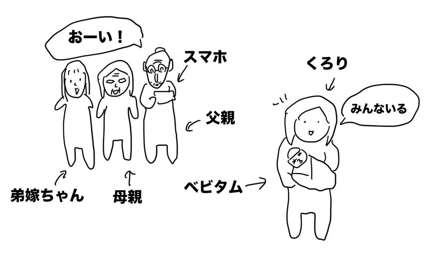 ベビタムを両手に抱えて、1Fに行くと両親と弟嫁ちゃんが待ち構えている。