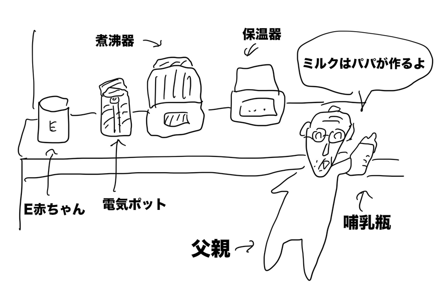 代わりに、哺乳瓶を下に置いて、お湯を入れ出す父親。