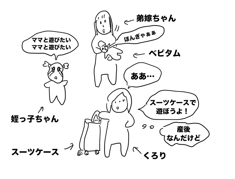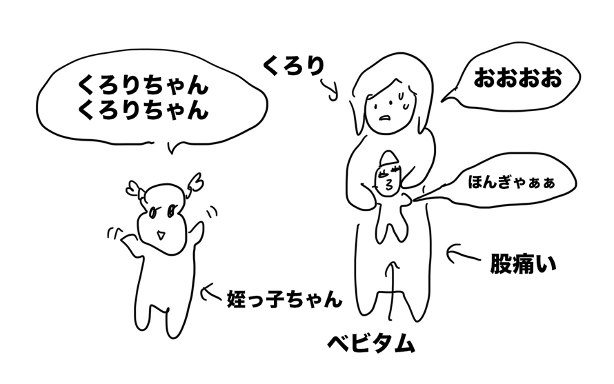飲み終えた哺乳瓶をキッチンに戻し、「遊んで遊んで」とやってくる姪っ子ちゃんの相手をしていると、リビングで弟嫁ちゃんがベビタムを抱っこしている。