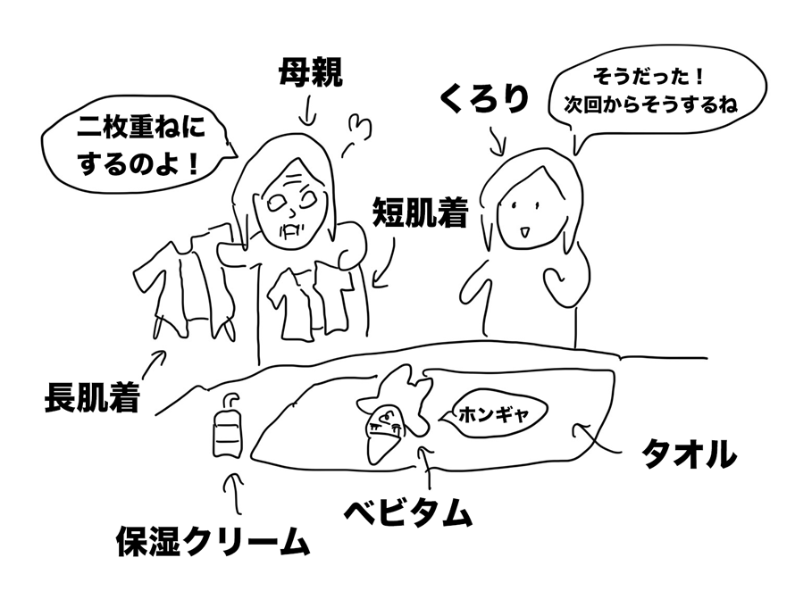 しかし、途中で二枚重ねにした肌着が、沐浴前に着ていた服だったと途中で気づく。