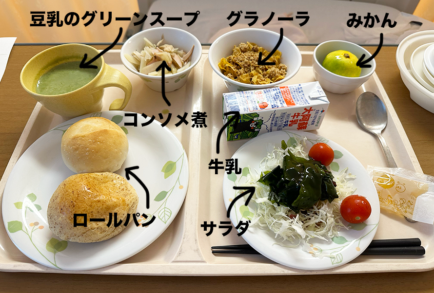 7時になると朝ごはんが運ばれてきたので、サクッと食べる。
