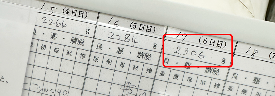 体重記入欄はまだ空白のようで、今日退院できるかはまだ不明。2300g超えなかったらまた延泊だ。