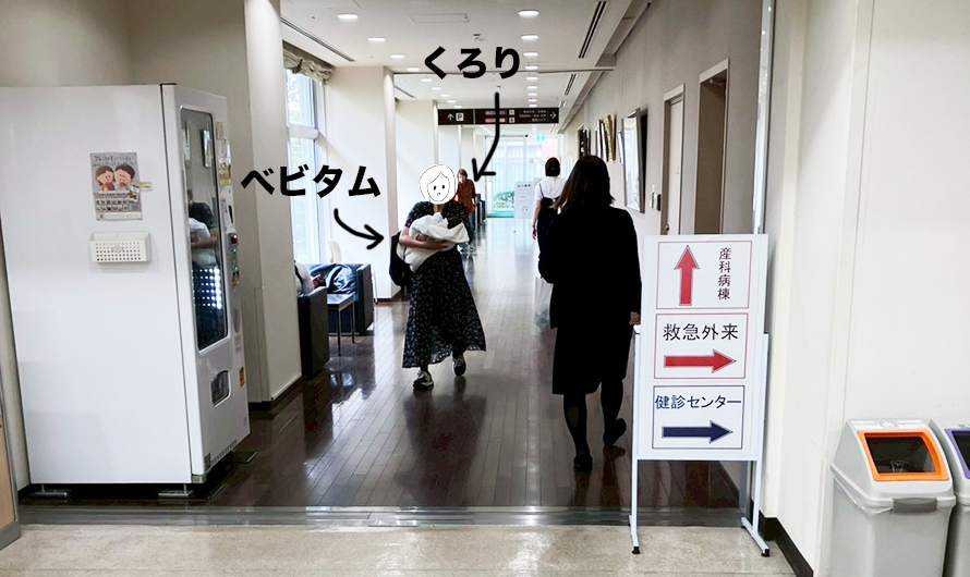 まずはオムツ交換。肌着はちょっとうんこにまみれていたけど、どうせ後で退院着に着替えさせるしなと思い、そのまま目を瞑って授乳室に移動。
