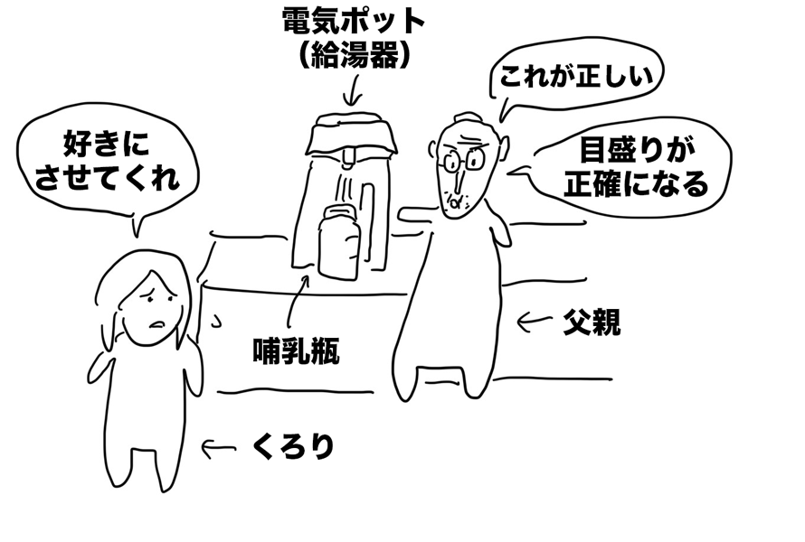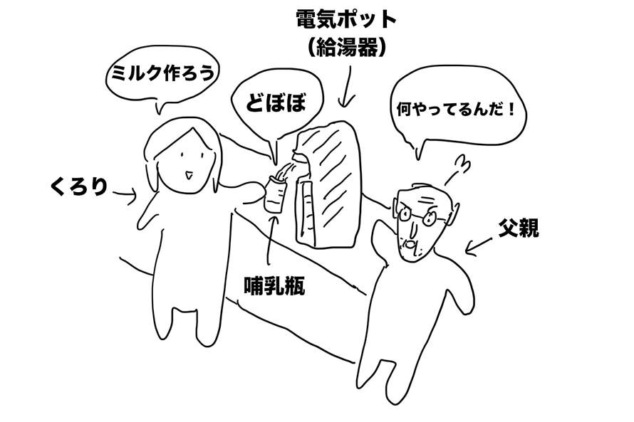 哺乳瓶を持ち上げて、電気ポットからお湯を注いでいると、父親が怒り出す。