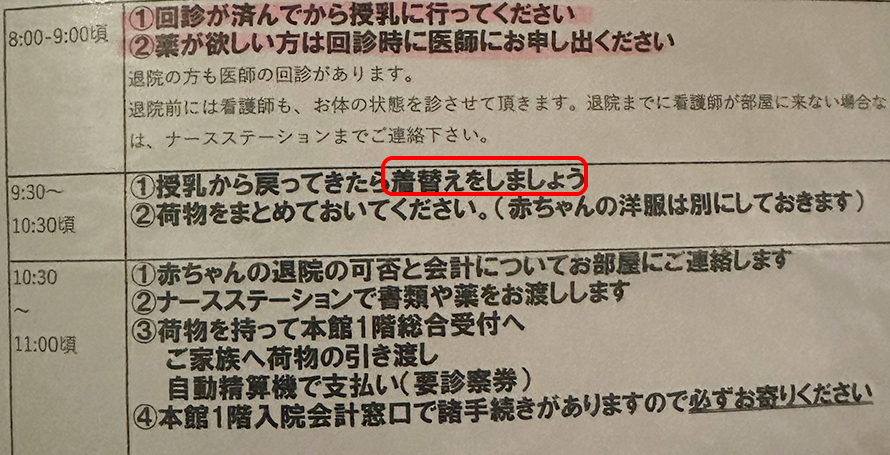 退院の手順表を見ると、「まず着替えましょう」と書いてある。