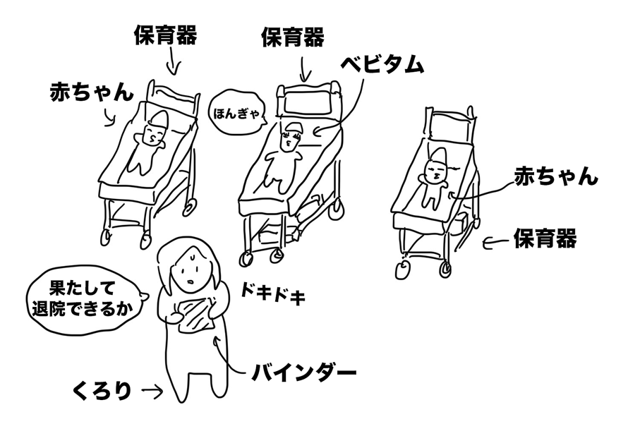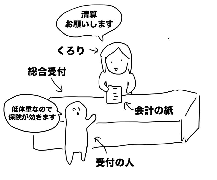 会計の人「今回は低体重出産なので、一部保険適用になります。別途支払いいただきますので、保険証ができあがったら、後日清算に来てください」