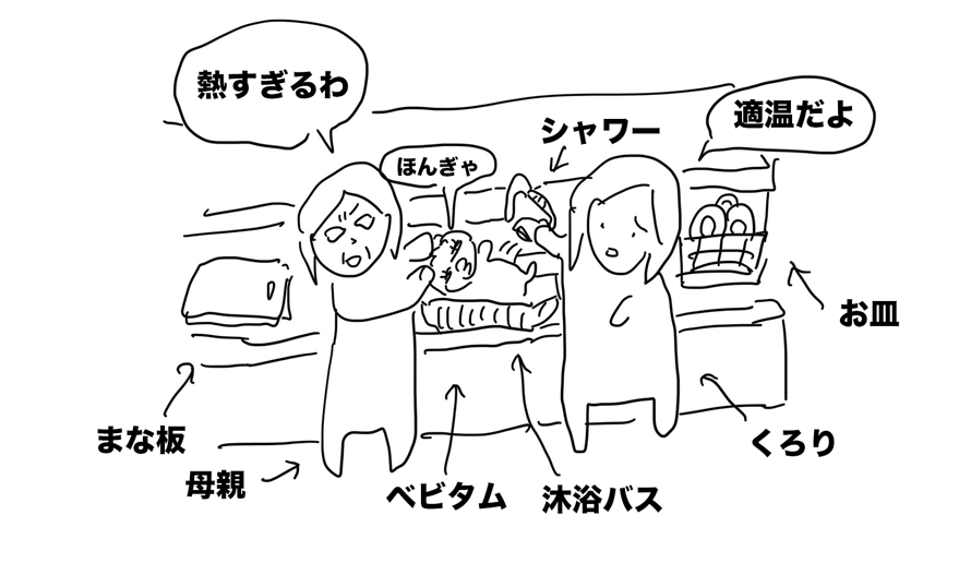ちなみに、キッチンのお湯は40度以上は出ず、沐浴のお湯自体が40度くらいなので、どう考えても熱すぎということはない。