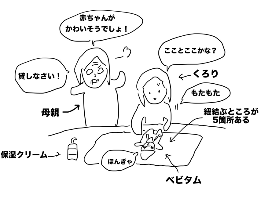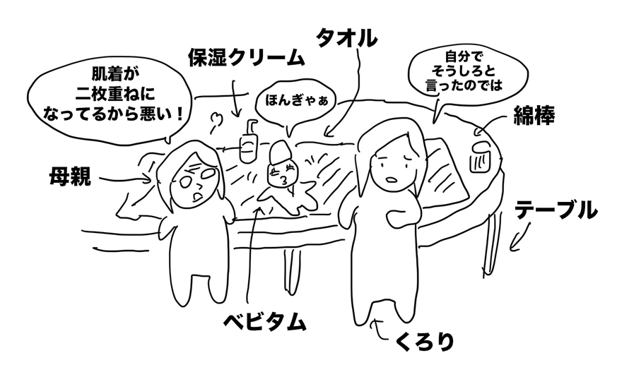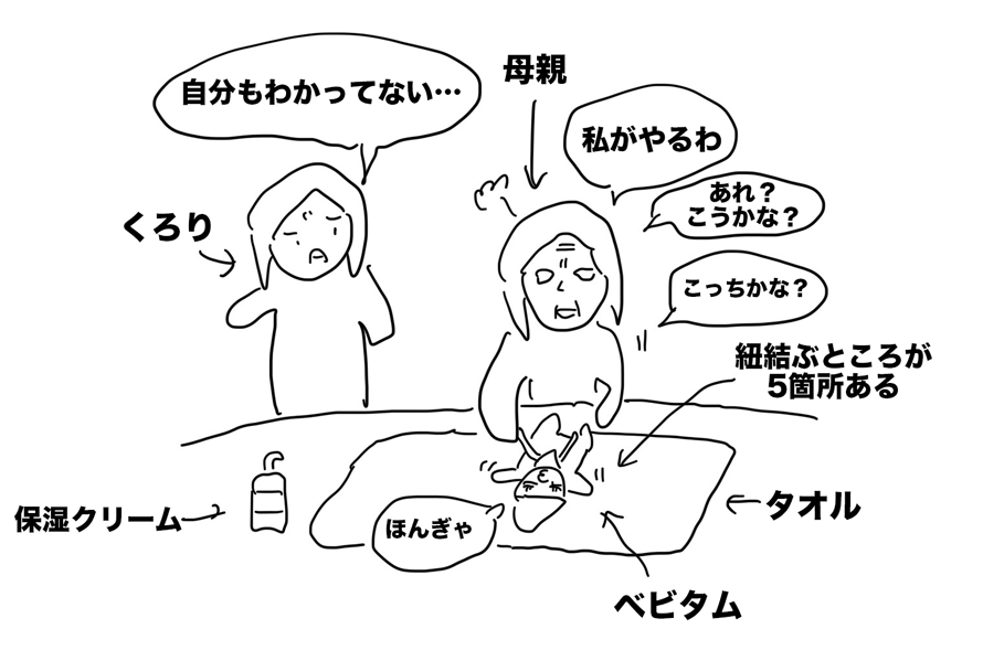 肌着の紐をわからないながら、一所懸命結ぼうとしていたのに、隣から割り込んでくる母親。