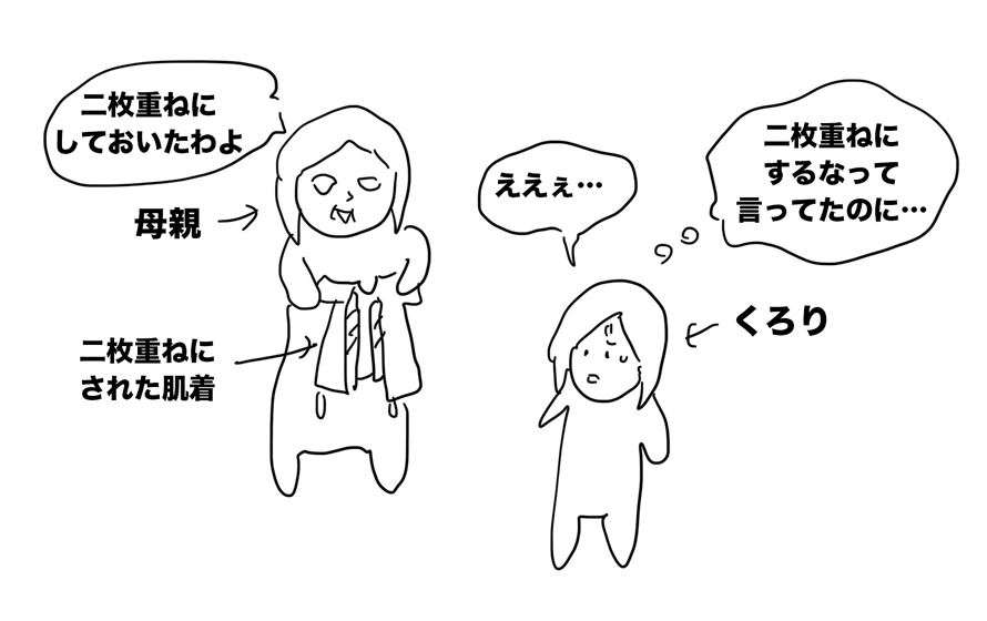 まず、初日は「肌着は二十重ねにしろ」と言われ、2日目は「なんで二重に重ねるの!」と言われたので、今日は別にしておこう。