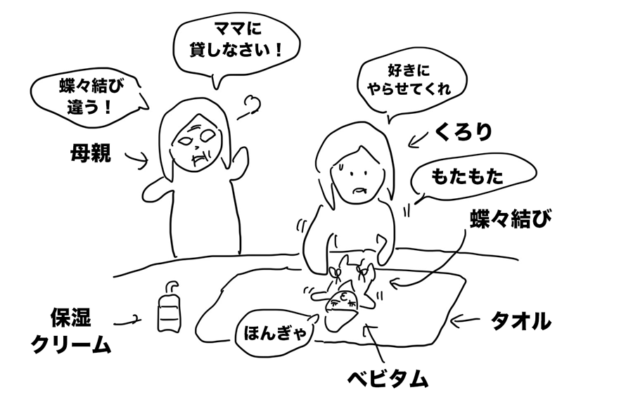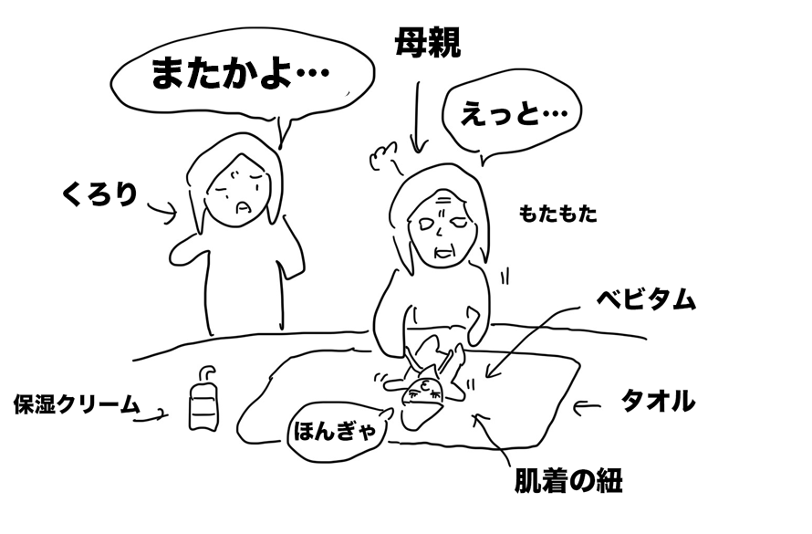 タオルや保湿クリームなど、いろいろと準備をしていると、母親が何かもそもそしている。