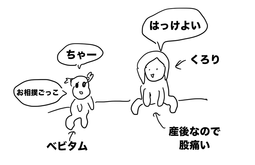 ちなみに、本日退院5日目。股を縫ったあとがズキズキ痛む中、ハッケヨイの体勢からお相撲さんごっこをしてあげた。
